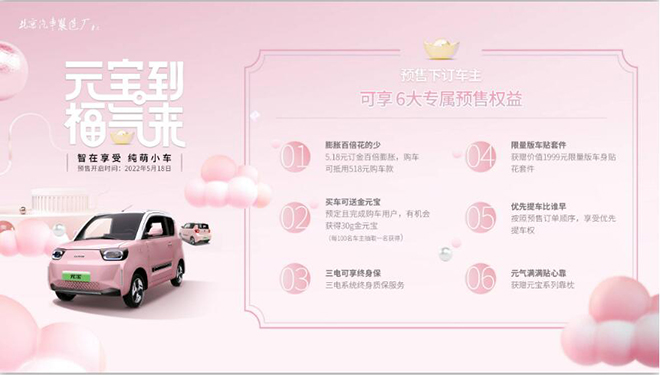 5月18日,北汽制造品牌旗下首款純電小車——元寶正式開啟預售,新車預售價格區間為3.49萬至4.99萬元。依托于新平臺的技術優勢,元寶不僅擁有小巧可愛的外觀,更整合了多項前沿智能科技配置,為消費者帶來“智萌雙全”的產品享受。憑借3.49萬元起的預售價,元寶給用戶帶來了極大的驚喜,而在驚喜價基礎上,為了讓消費者再享實惠,元寶進一步推出6大專屬預售權益,惠及預售期內所有訂車用戶,如此極具誠意的購車禮遇實在不容錯過。