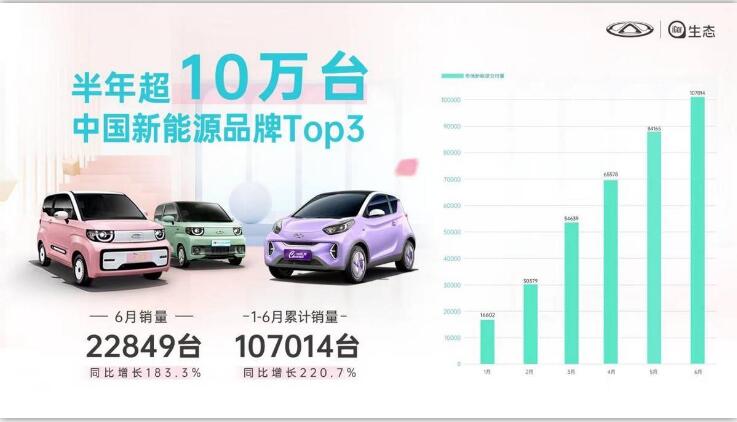 在競爭激烈的新能源汽車市場,奇瑞iCar生態(tài)的成績更為亮眼。以小螞蟻和冰淇淋為代表的新能源乘用車6月銷量22849輛,同比增長183.3%;上半年累計銷量107014輛,同比增長220.7%,成功登頂中國新能源品牌排名TOP3,以領(lǐng)先行業(yè)1倍的增速跑贏新能源汽車增長大盤。