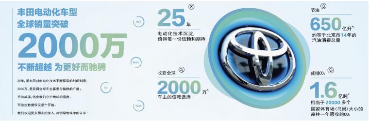25年來,豐田電動(dòng)化車型全球銷量突破2000萬,節(jié)油650億升,約等于北京市14年的汽油消費(fèi)總量。減排二氧化碳1.6億噸,相當(dāng)于20000多個(gè)國(guó)家體育場(chǎng)(鳥巢)大小的森林一年吸收的二氧化碳。這是豐田對(duì)電動(dòng)化技術(shù)不斷探索的時(shí)間刻度;2000萬,是獲得全球車主喜愛與信賴的廣度;節(jié)油減排,飽含豐田守護(hù)地球的溫度。豐田不斷超越為更好而馳騁。
