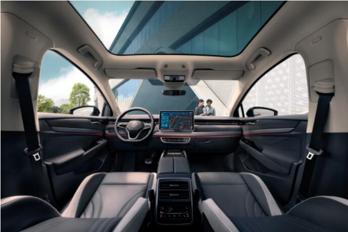 ID.7 VIZZION的內飾跟ID.4 CROZZ和ID.6 CROZZ有所區別,對內飾進行了全新升級,采用環保一體式設計,高度整合內部空間,將儀表顯示屏、空調出風口及車門內把手放在同一個平面上,這樣的設計使得整個內飾簡潔大氣,整體視效更具整體感,凸顯內飾空間的寬大。
