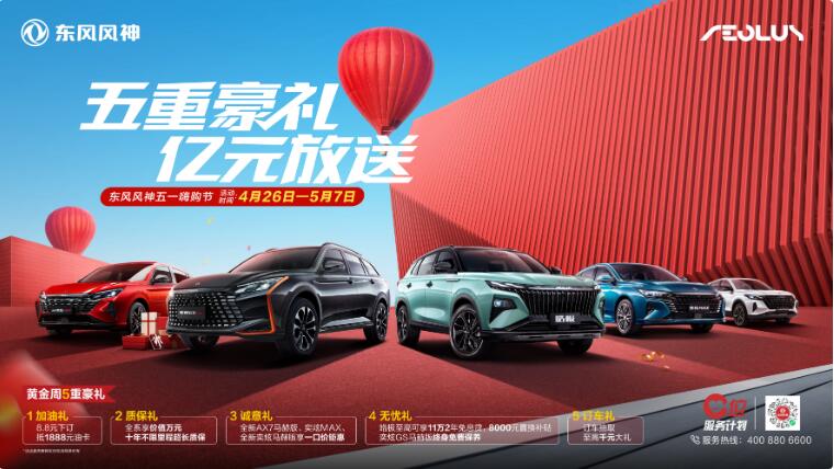 選擇一款適合自己的汽車,能讓我們有更多的自由和更獨立的空間,讓旅途變得更加輕松愉快!為了滿足客戶對于小長假的出行需求,東風風神特推出黃金周5重豪禮:
