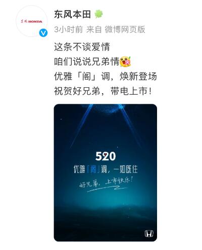 在自主品牌抱團逆襲的中國汽車市場,5月20日,廣汽本田全新雅閣上市,而東風本田官方賬號在第一時間進行了祝賀。此次互動也是東風本田和廣汽本田為數不多的幾次官方互動。