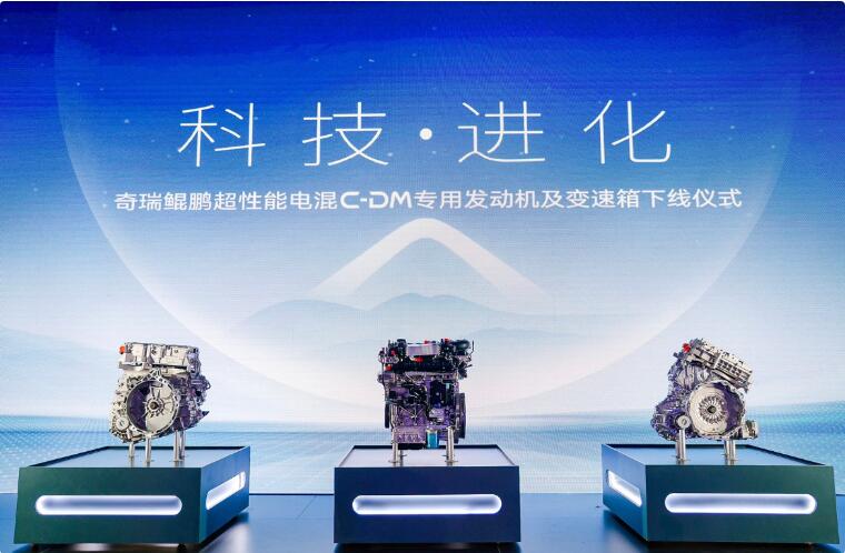 圖為奇瑞鯤鵬超性能電混C-DM專用發動機及變速箱下線儀式現場