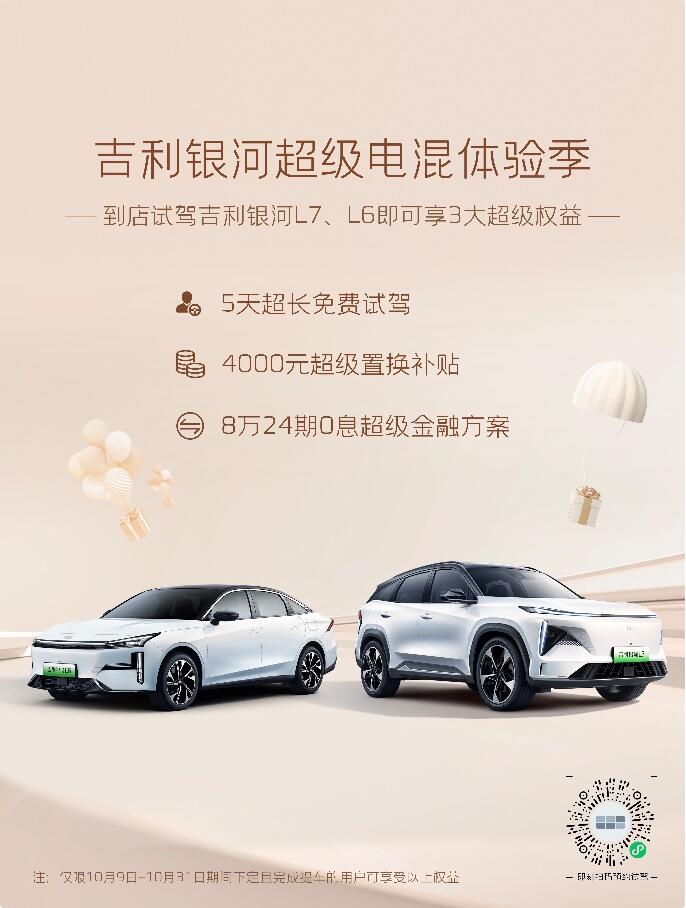 據了解,試駕體驗滿意的用戶,如果于10月9日至31日期間下定吉利銀河L6或L7并完成提車,還可以享受兩大購車權益——8萬24期0息或48期低利率至高6300元貼息的超級限時金融方案和4000元置換補貼的超級限時置換政策。