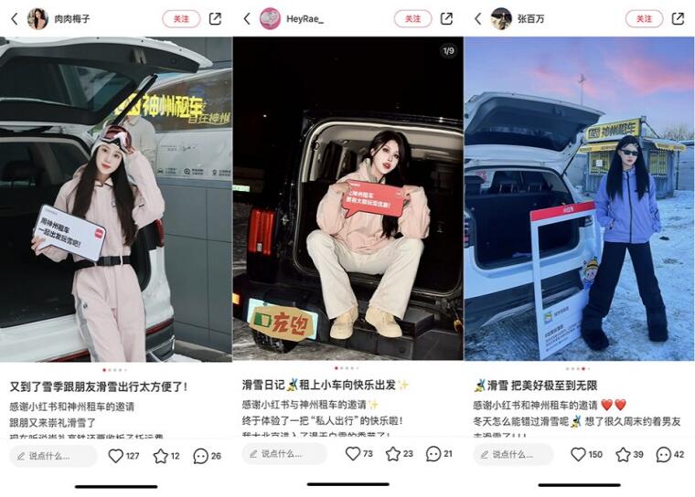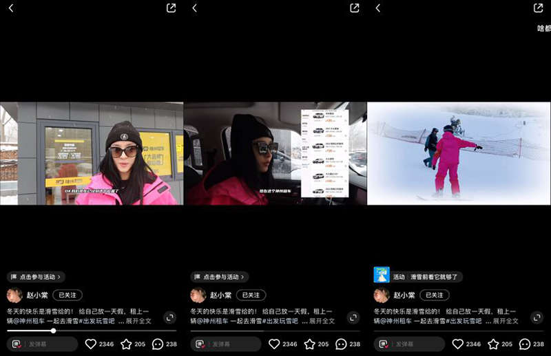 隨著趙小棠的租車滑雪筆記率先打開聲量,旅行、攝影、時尚穿搭等賽道的KOL也駕駛著從神州租車租賃的車輛,在這個冬天用自駕游的方式踏上了一場久違的租車滑雪之旅。