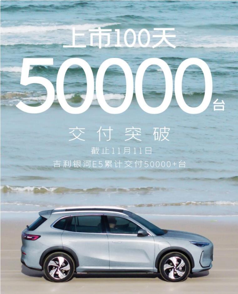 基于GEA架構打造的吉利銀河E5,同時也是首個搭載應用神盾短刀電池、銀河11合1智能電驅、銀河Flyme Auto智能座艙系統等先進技術的產品。出色的產品力,令吉利銀河E5上市100天,交付量已突破5萬臺,成為名副其實的“爆品”。