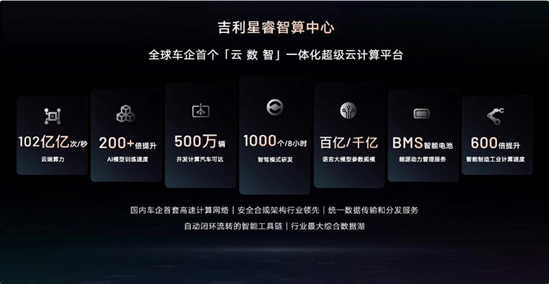 智能化功能的實(shí)現(xiàn),離不開吉利星睿智算中心的強(qiáng)大算力底座。星睿智算中心是全球車企首個(gè)“云-數(shù)-智”一體化超級(jí)云計(jì)算平臺(tái),目前可滿足500萬在線車輛并發(fā)計(jì)算需求。星睿AI大模型,正是吉利依托強(qiáng)大算力打造的全球首個(gè)汽車行業(yè)全棧自研全場(chǎng)景AI大模型,已獲中國(guó)通信院“4+級(jí)”最高等級(jí)評(píng)級(jí)。基于星睿AI大模型與豐富內(nèi)容生態(tài)開發(fā)而來的AI銀河精靈,從車端、移動(dòng)端全鏈路解決用戶用車問題,成為“全場(chǎng)景AI超級(jí)伙伴”。