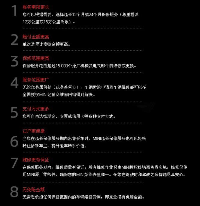 考慮到MINI車主對于激動強度的高標準嚴要求,我們的延長保護在服務期限,賠付金額,保修范圍等方方面面都將提供更高的品質保障,一切只為讓MINI車主的激動更安心,更放肆。