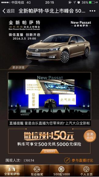 一款新車的發布會, 一場科技與時代相融合的視覺盛宴, 一次13萬人的直播互動...... 這不僅僅是一場新車發布會,更是一次時代的躍進! 此次全新帕薩特華北區域上市峰會,已經成為一場震撼的視覺盛宴與互動狂潮! 3月5日,全新帕薩特,不失所望, 與13萬觀眾一起引領了一個新時代的到來!