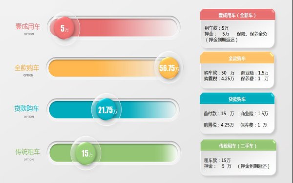 Q 都有哪些車型可供消費(fèi)者選擇? A 目前我們已與奔馳、寶馬、奧迪、保時(shí)捷、路虎、捷豹、沃爾沃、雷克薩斯、英菲迪尼、謳歌、JEEP 11個(gè)高端汽車品牌合作,為消費(fèi)者實(shí)時(shí)提供多款車型任其挑選。 Q 除了使用費(fèi)還有其他的費(fèi)用嗎? A 用車費(fèi)用僅為全新車價(jià)的10%,第二年開(kāi)始則使用費(fèi)用會(huì)逐年遞減,即比上一年的使用費(fèi)用再減少10%。另外,用車須繳納保證金(與首年用車費(fèi)用一致),合同到期則原數(shù)歸還。 Q 選用的車輛是否確保全新? A 這一點(diǎn)是肯定的,壹成用車提供的車輛均為全新車輛。這點(diǎn)也是區(qū)別于傳統(tǒng)租車的標(biāo)志性優(yōu)勢(shì)。