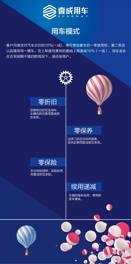 模式:非等閑之輩,雙贏 眾所周知,汽車租賃業(yè)在歐美國(guó)家發(fā)展最為成熟,國(guó)內(nèi)民眾近幾年也逐步走向租車生活。拿美國(guó)舉例,它是一個(gè)車輪上的國(guó)家,在那里最好的旅行方式莫過(guò)于“自駕車”。美國(guó)的汽車租賃業(yè)相當(dāng)發(fā)達(dá),就連小李子(萊昂納多·迪卡普里奧)這樣的明星也常租車出行。而國(guó)內(nèi)消費(fèi)者的消費(fèi)理念也趨于理性化,對(duì)于一些想用好車,卻并沒(méi)有足夠資金支持的時(shí)候,租車是一個(gè)最好的方式。 注:Q = 記者 A = 梁華先生 Q 作為新模式,壹成用車是如何與傳統(tǒng)租車模式區(qū)分的? A 壹成用車與傳統(tǒng)租車有著本質(zhì)的區(qū)別,壹成用車的核心理念是高端汽車的服務(wù)管家,消費(fèi)者永遠(yuǎn)有決定車輛的歸屬權(quán),消費(fèi)者在用車過(guò)程中再?zèng)Q定車輛是否購(gòu)買。 Q 新模式對(duì)于消費(fèi)者而言,又有怎樣的吸引力? A 對(duì)于消費(fèi)者而言,壹成用車完全解決了消費(fèi)者所需要承擔(dān)的車輛折舊貶值、費(fèi)時(shí)費(fèi)力的保養(yǎng)和保險(xiǎn)以及一次性投入資金大等一系列問(wèn)題,同時(shí),壹成用車所提供的車輛,均為高端品牌車,讓消費(fèi)者提前享受應(yīng)有的品質(zhì)生活。 “比擁有更好!”是壹成用車的用戶服務(wù)理念,壹成用車讓消費(fèi)者體驗(yàn)到使用比擁有更好的消費(fèi)模式,更加熱衷于年年開(kāi)新車,顏值歲歲高。 性質(zhì):買車租車都已OUT ,用車至上 Q 壹成用車與買車、貸款購(gòu)車、傳統(tǒng)租車三者對(duì)比,有怎樣的優(yōu)勢(shì)? A 全新車輛、零保養(yǎng)、零保險(xiǎn)、零折舊,是我們給消費(fèi)者最真情的回饋,壹成用車確保消費(fèi)者在合同內(nèi)使用全新車輛的過(guò)程中,只需支付選用車輛10%的費(fèi)用,如果愿意續(xù)用,則第二年起即刻逐年遞減10%的使用費(fèi),讓消費(fèi)者自行決定車輛的歸屬權(quán),試用期間,實(shí)時(shí)幫助用戶做到省事、省時(shí)、省錢。