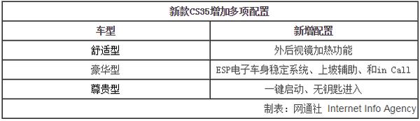 新款CS35新增1.5T渦輪增壓發(fā)動(dòng)機(jī),并有望推出兩款全新車型—1.5T運(yùn)動(dòng)型和1.5T豪華運(yùn)動(dòng)型。此外,在其他車型配置方面均有提升。包括舒適型增加外后視鏡加熱功能;豪華型增加ESP電子車身穩(wěn)定系統(tǒng)、上坡輔助、和in Call等配置;尊貴型增加一鍵啟動(dòng)、無(wú)鑰匙進(jìn)入兩項(xiàng)配置。新車將在3月正式上市。